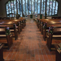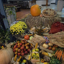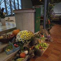 Kindergartenkinder hatten zuvor bereits einige Spenden - Obst und Ähnliches - in die Kirche gebracht. Wir erhielten von Casa Flora zwei prächtige Blumentöpfe, von Edeka wunderbare Äpfel, Steckrüben und mehr. Die Gärtnerei Kobs hatte für uns leuchtende Kürbisse zum Schmücken gespendet und die Bäckerei Beyer zwei wunderbare Festtagsbrote mit der Aufschrift "Erntedank". Aber auch viele Privatpersonen trugen mit Obst, Gemüse, Blumen, Zweige und weitere Gaben dazu bei. Als das wurde von fleißigen Händen zu einem sehr schönen Arrangement in der Kirche zusammengeführt.