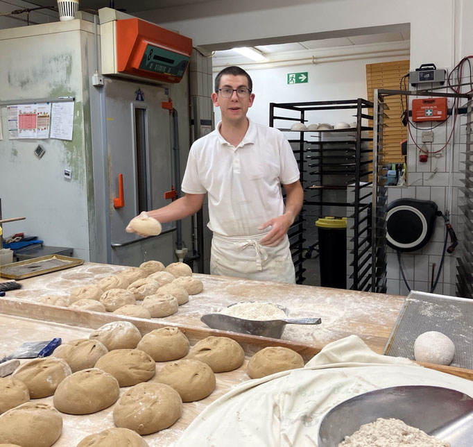 Wir bekamen während des laufenden Betriebes einen sehr informativen und umfangreichen Einblick in das "Bäcker-Hand-Werk" - im wahrsten Sinne des Wortes, hier wird Tag für Tag sehr viel Handarbeit geleistet: ob beim Durcharbeiten der Rohlinge für Rosinenstuten und Dinkelbroten oder beim Einarbeiten der Butter in den Blätterteig, aus dem später leckere Franzbrötchen oder anderes Gebäck entsteht. Grundlage für alle Brot- und Brötchensorten ist "Steinmetz-Mehl", das aus gewaschenem Getreide hergestellt wird, mithin gesünder und bekömmlicher ist.